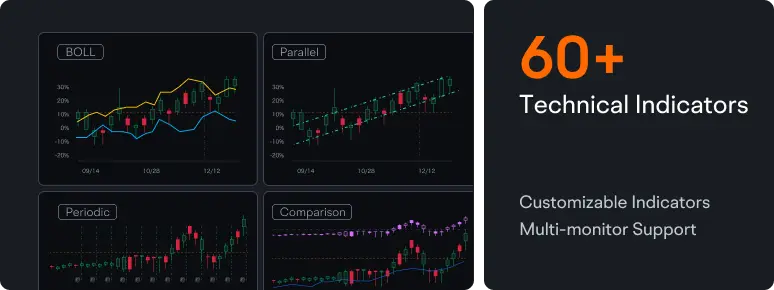 Analyze trends and patterns with 60+ technical indicators and add visuals to charts using 38+ drawing tools.